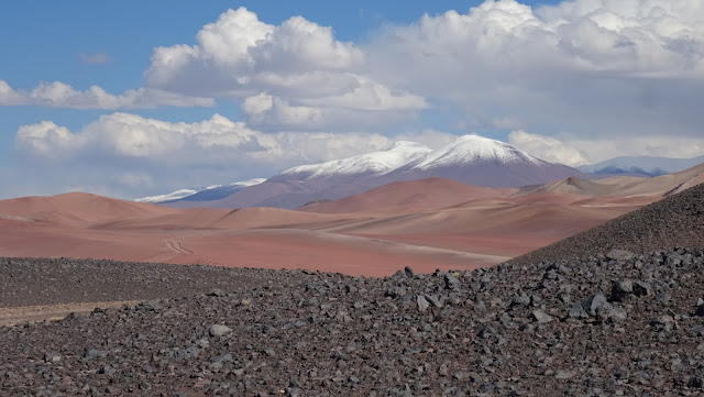 Ya deberíamos estar cerca de los 5000 msnm y se veía un pequeño campo de piedra pómez, un tremendo volcán mocho y clarito se veía al acercarnos el caminito de azufre que iban dejando las tolvas al transportarlo desde la Mina hasta La Casualidad en un cable carril. Muuy impactantes esas vistas, una sensación de estar en otro mundo... Y ¡hasta el Llullaillaco se veía!